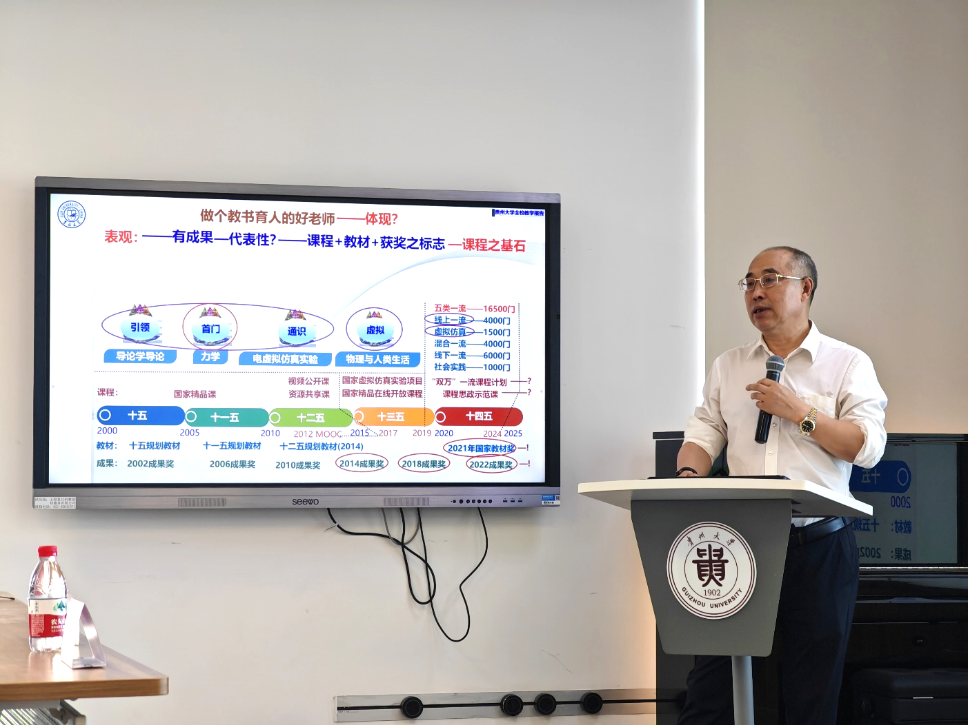 2025年6月17日下午,贵州大学教师工作处联合物理学院举办“新时代教师核心素养与AI教育创新”教学工作坊,首场讲座特邀吉林大学张汉壮教授作专题报告。张教授以《如何做个新时代的好老师》为题,从课程内容、教学方法、教学过程三个维度,深入剖析新时代教师的核心素养与育人使命。讲座由物理学院党委书记梁方毅主持,教师工作处副处长唐颖、物理学院副院长刘艳辉出席,全校36个学院百余名青年骨干教师参与学习。