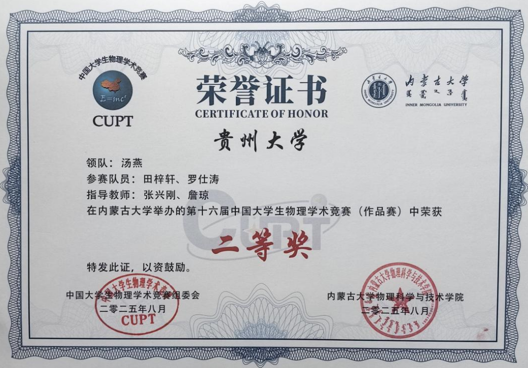 第十六届中国大学生物理学术竞赛CUPT)决赛2025814日至819日在内蒙古大学赛罕校区隆重举行。贵州大学物理学院代表队历经省赛和西南赛的激烈角逐,成功进入全国决赛,并在决赛中荣获作品赛二等奖。