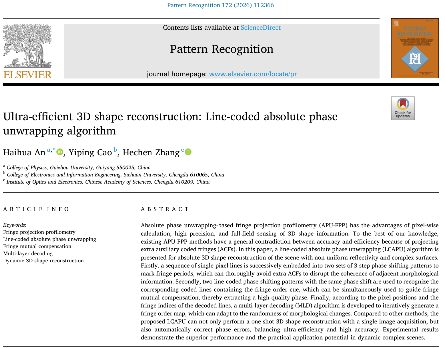 近日,物理学院安海华老师在国际顶级期刊Pattern Recognition上发表题为“Ultra-efficient 3D shape reconstruction: Line-coded absolute phase unwrapping algorithm”的研究型学术论文,并为该文第一作者和通讯作者,该研究工作的发表是物理学院在光学及其交叉学科领域的又一标志性突破。