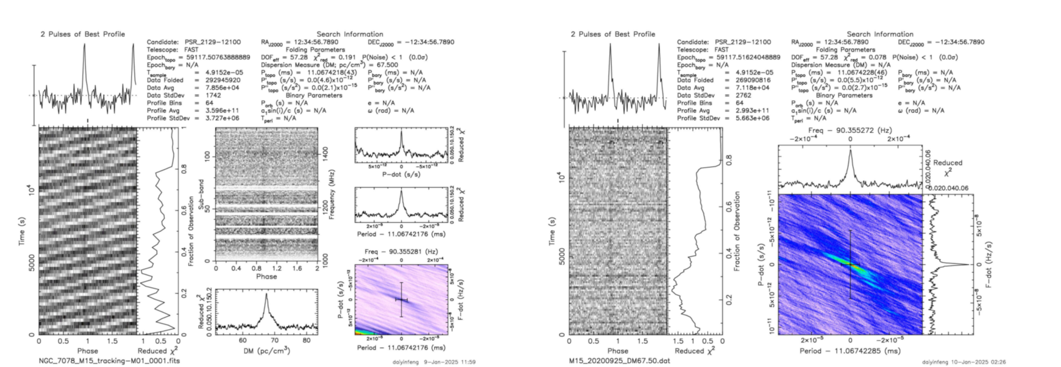 图一:新发现毫秒脉冲星M15O 的PRESTO 折叠图,分别是包含了已知 脉冲星信号和剔除已知脉冲星信号的结果