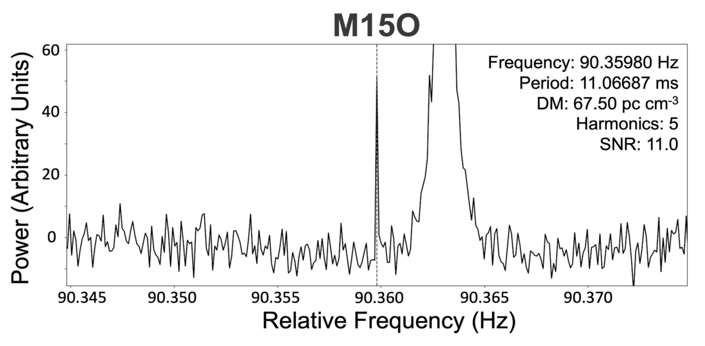 近期,贵州大学物理学院张立云教授团队与中国科学院国家天文台FAST运行和发展中心潘之辰、钱磊副研究员合作,利用中国天眼500米口径球面射电望远镜FAST望远镜在球状星团M15 (NGC7078) 中发现一颗孤立毫秒脉冲星M15O (又称为PSR J2129+1210O),其自转周期约为11.06687 ms,色散量约为67.44 pc cm−3(见图一)。这个脉冲星信号和已知脉冲星的谐波信号具有非常相似的周期,使用我们自己的方法被成功识别。相关科研成果已在SCI期刊RAA(Research in Astronomy and Astrophysics)上发表;RAA就这一工作作相应的新闻报道。