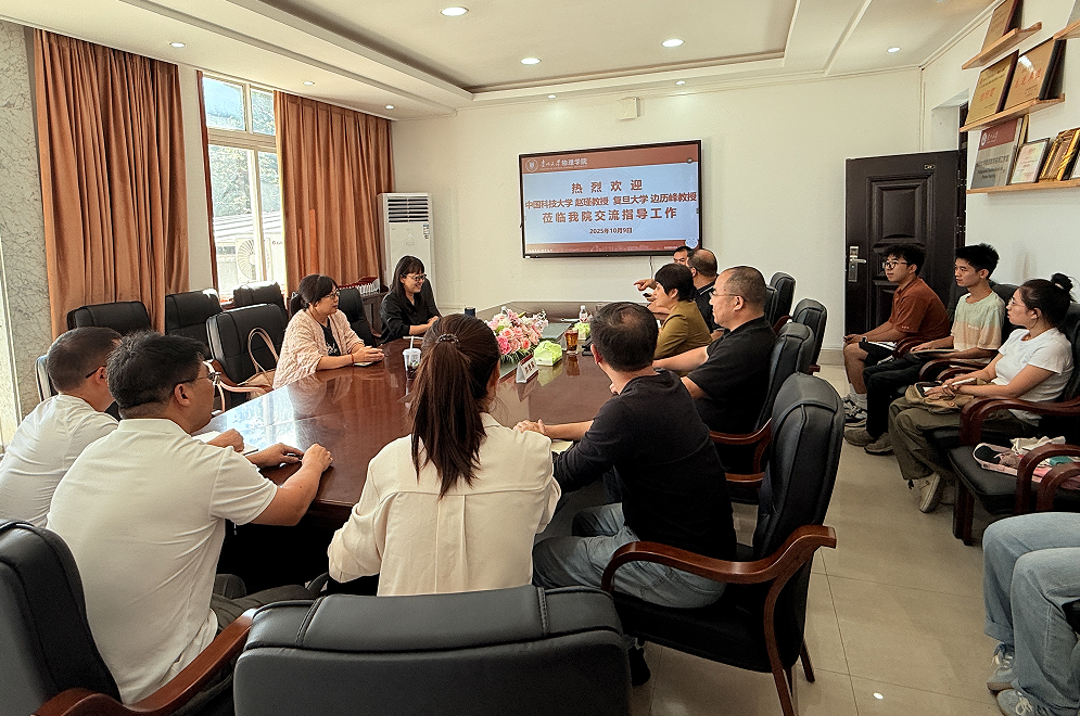 2025年10月9日,中国科学技术大学赵瑾教授(2025科学探索奖获得者)、复旦大学边历峰教授莅临贵州大学物理学院,就中国科大对贵州大学物理学科组团帮扶、“甲秀之光”访问学者赴中国科大研修等工作开展交流指导。物理学院党委书记梁方毅、副院长祁小四、刘艳辉,“甲秀之光”访问学者张兴刚、周江、郑国辉、丁俊飞等四位教师,以及学院凝聚态物理方向的部分师生参与座谈。
