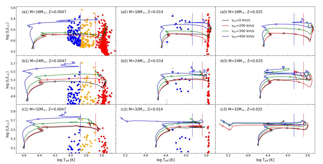 图二:不同初始质量,金属丰度和转动速度的大质量星在赫罗图中的演化。
