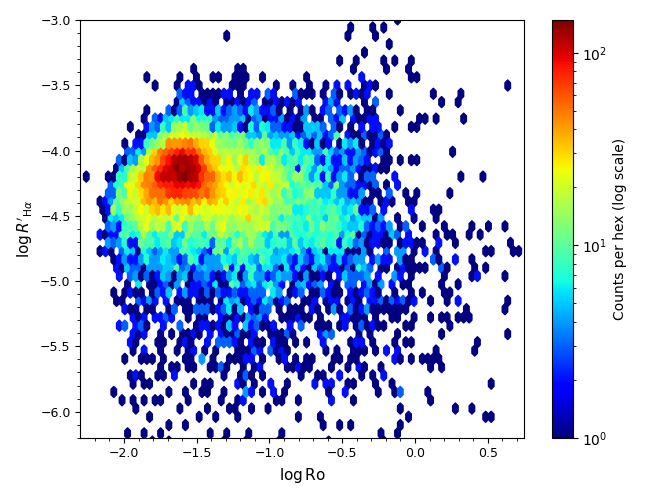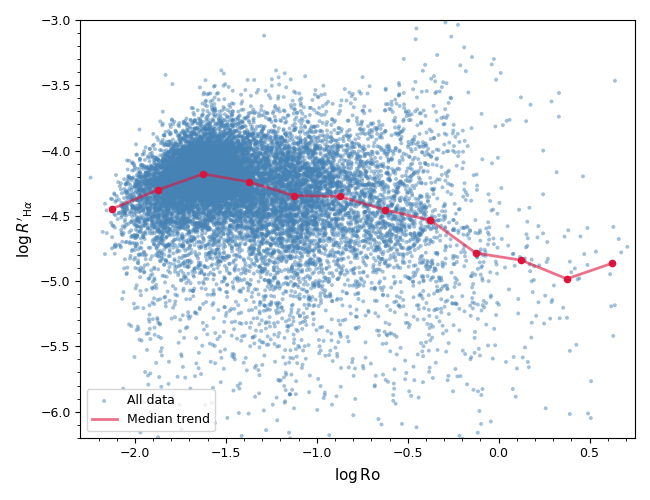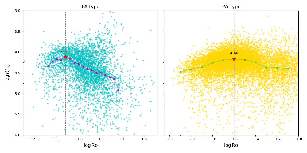 3:不同几何类型食双星的色球活动与Rossby数关系。EW系统展现出延迟饱和与超饱和特征。