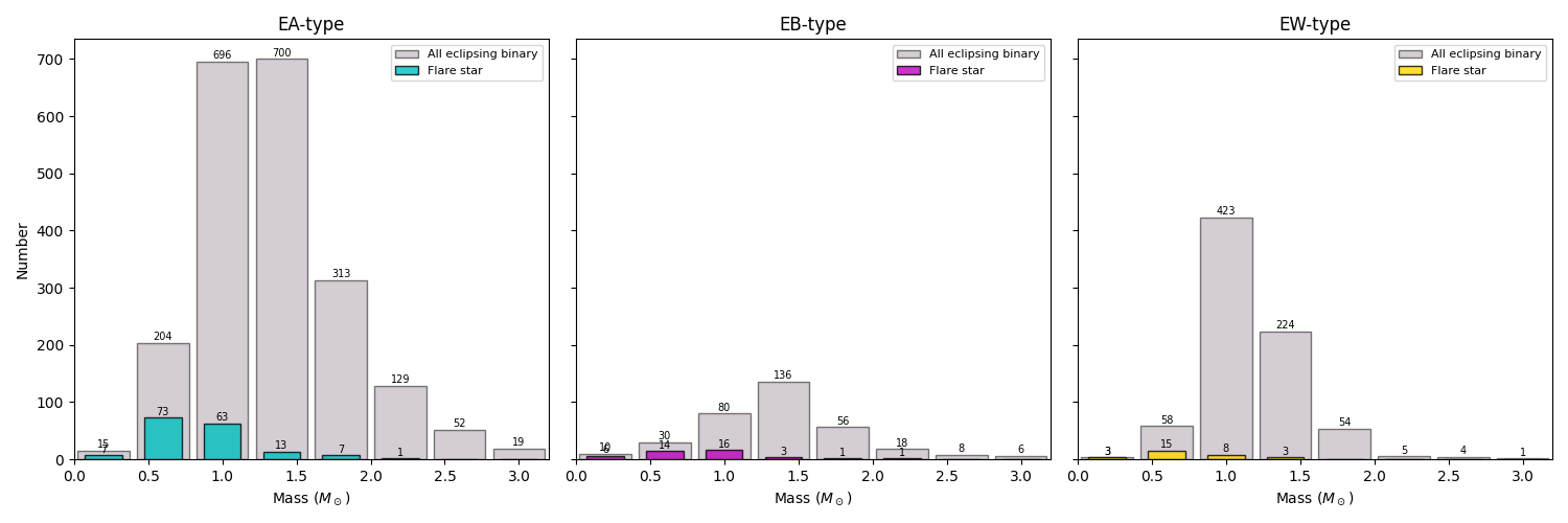 同时,团队结合TESS光变曲线分析了恒星黑子调制与耀发现象。结果显示,恒星黑子调制幅度与活动紧密相关,证实了近双星强磁场的普遍存在。在耀发现象方面,共探测到1752次耀发事件,其中EA1179次、EB429次、EW144次。EB系统表现出最高的平均耀发频率,而EW型虽然旋转极快,却展现出最低的耀发数量和能量,说明其特殊几何结构可能抑制大尺度磁场重联。耀发能量分布覆盖10³²–10³⁷ erg,符合磁重联释放能量的理论预期(图1)。