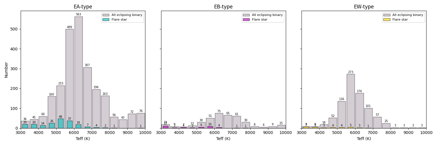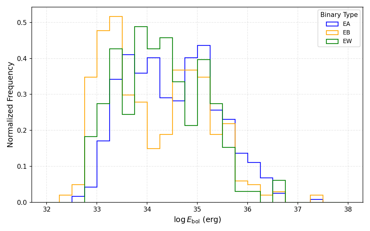 1:不同类型食双星耀发能量分布对比。EA型在高能端更为突出,而EW型能量范围相对狭窄。