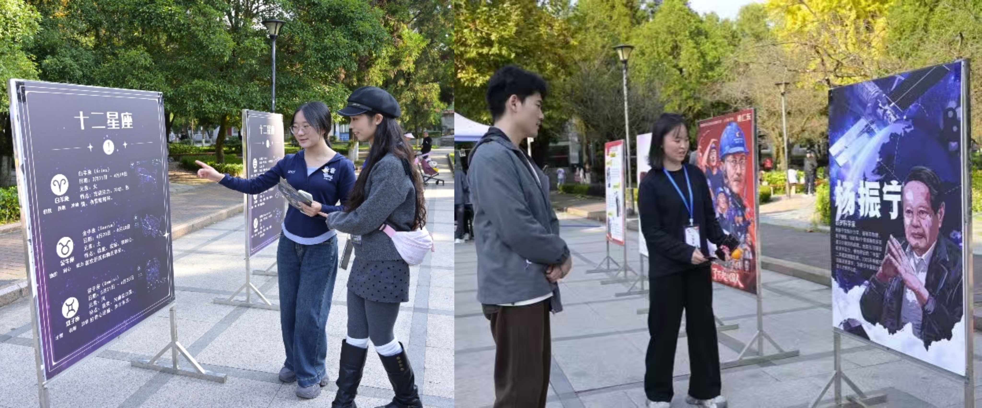 活动伊始,天文知识科普区化身为融合“课程思政”理念的生动课堂。从八大行星的物理特性到日月食形成的天体力学原理,从星系演化的科学规律到星云与黑洞的现代天体物理前沿,丰富的科普内容层层递进。现场更以传承科学家精神为主线,讲述几代科技工作者坚守理想、勇攀高峰的感人事迹,引导青年学生树立远大志向,涵养探索精神与家国情怀。