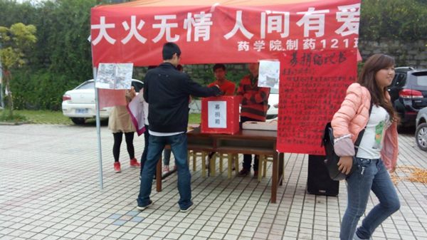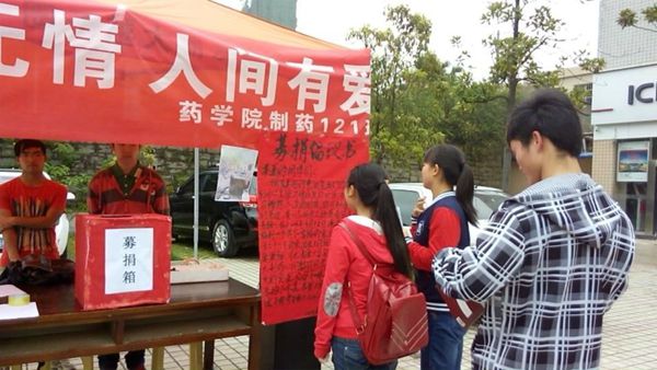 为了进一步帮助这个困难中的学生完成学业,在院团委、学生会的支持下,彭×同学所在的班级制药工程121班班委于 4月10、11日两天在学校南区食堂门口展开了募捐活动。
