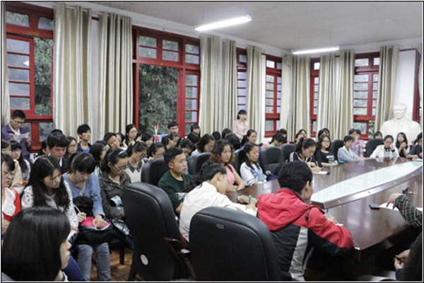 座谈会首先由李振兴、袁旭寒同学与大家分享了自己的考研经验。李振兴同学从报考学校、考研策略、考研方向的选择讲述了自己对于考研的经验和认识。袁旭寒同学说“选择了考研就要坚持下去。在备考的过程中,枯燥、乏味、无聊在所难免。考研需要信心和耐心。既然选择了,就要坚持到底!”她告诉同学们,考研需要坚强的毅力、高效的学习效率、强烈的自信心、超强的自律、坚持到底的决心。刘雄利老师以自身为例与同学们分享了自己考研、考博的经验,鼓励在场的同学增强自信心,让同学们体会到考研、考博不再那么遥远。