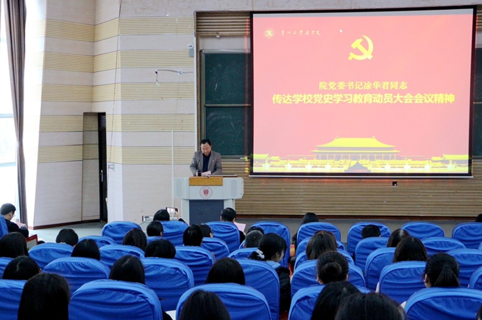 为深入学习贯彻习近平总书记在党史学习教育动员大会上重要讲话精神,认真落实贵州省委、省委教育工委及校党委党史学习教育动员会议精神,加强学院党风廉政建设,2021年4月9日下午2点,药学院党史学习教育动员大会及2021年度党风廉政建设暨警示教育大会在西楼117报告厅成功召开。院党委书记凃华君,院党委副书记、院长欧阳贵平,院党委副书记张豫芳,院党委委员、副院长李焱,院党委委员聂赟出席会议,学院全体教师、师生党员、党员发展对象、入党积极分子等共150余人参加,会议由欧阳贵平主持。