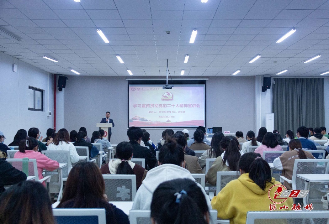 为深入学习贯彻党的二十大精神,迅速掀起党的二十大精神学习热潮,11月23日晚上,药学院党委在雅文楼217b开展了学习贯彻党的二十大精神宣讲会,本次大会由院党委书记凃华君主讲,副院长何述钟、学院全体党员、入党积极分子代表、党员发展对象代表共100余人参加。