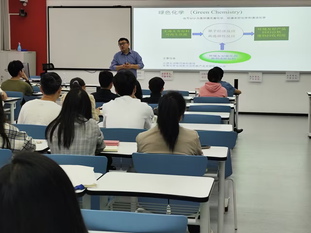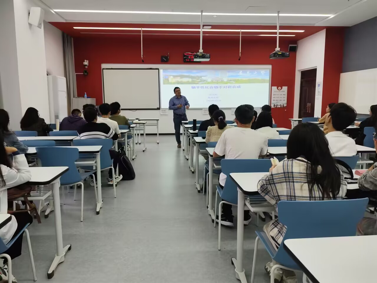 报告会上,刘人荣教授先从手性分子广泛存在于药物分子,以及绿色化学对手性分子的需求入手,详细讲解了手性的定义、手性化合物的分类、手性化合物合成方法,接着论述手性不对称合成的重要性、轴手性化合物的不对成合成进展,以及我国在轴手性化合物不对称合成等方面的进展。刘教授循序渐的讲解,不仅向同学们回顾了不对称合成知识,而且拓展了同学们对不对称合成在药物分子合成中的应用的认识和理解。