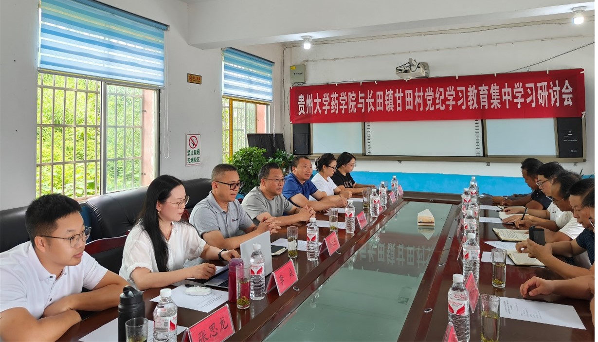 (通讯|刘雅婷 戴隆满)718日,贵州大学药学院党委书记凃华君、院长潘卫东、正处级组织员李天强、副书记、副院长李焱一行8人赴贞丰县长田镇甘田村,开展药学院党委与甘田村党支部党纪学习教育集中学习研讨暨驻村工作调研座谈会。长田镇副镇长熊成举、贵州大学驻长田镇甘田村第一书记戴隆满、甘田村村支书张希江及部分村干部参加。