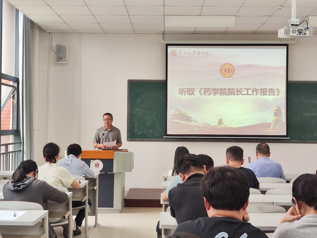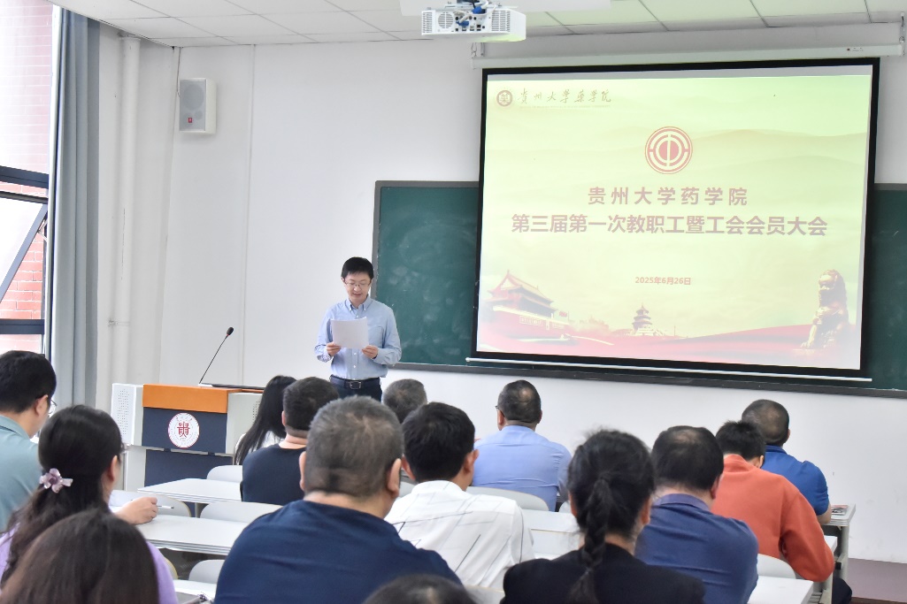(通讯|刘雅婷 张鑫宇)2025年6月26日下午,药学院第三届第一次教职工大会暨工会会员大会在崇义楼203教室隆重召开。药学院党委书记凃华君、院长潘卫东、校党委正处级组织员李天强、学院副院长兼副书记李焱、教育部西南药用生物资源工程研究中心副主任文庭池出席会议,药学院分工会会员参加会议。会议由药学院副院长何述钟主持。