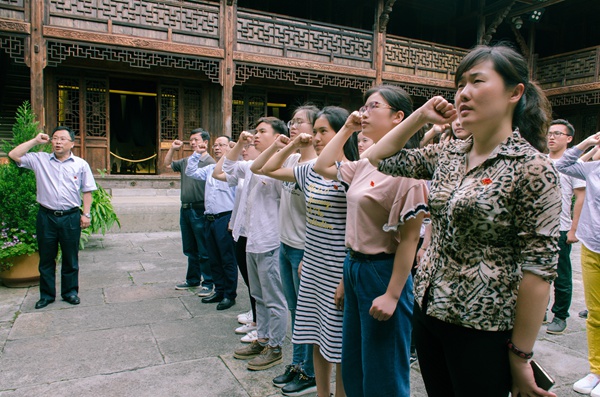 六月的黔南大地,处处尽显生机与活力,猴场更弥漫着“七一”的节日气氛。药学院党员一抵达猴场,就在讲解员的带领下参观了猴场会议会址,目睹着一件件遗物,一幅幅照片,无不令人动容与惊叹,顿时把时光拉回到了那个战火纷飞的年代,感知到革命的艰难与困苦,体味到党的正确与伟大。在猴场会议会址现场,凃华君带领全体党员重温了入党誓词,以使大家更加牢记历史使命和责任担当。