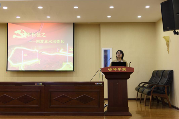 本次主题活动由地信党支部、勘技党支部、岩土党支部等七个党支部分别选取红军长征途中在贵州省境内发生的如“黎平会议”、“四渡赤水”、“遵义会议”等七个典型事例,以PPT的形式讲解红军长征途中在贵州发生的重大事件。活动评委由7个党支部推选出的学生代表、学生科漆晗老师、本科生党总支副书记苟潇、宣传委员肖宇担任。