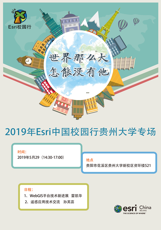 (贵大资环网讯 周涌|报道)2019年5月29日下午14:30-17:00,ESRI中国将在贵州大学资环学院521多媒体教室开展专场技术交流会,主要涵盖两方面内容:
