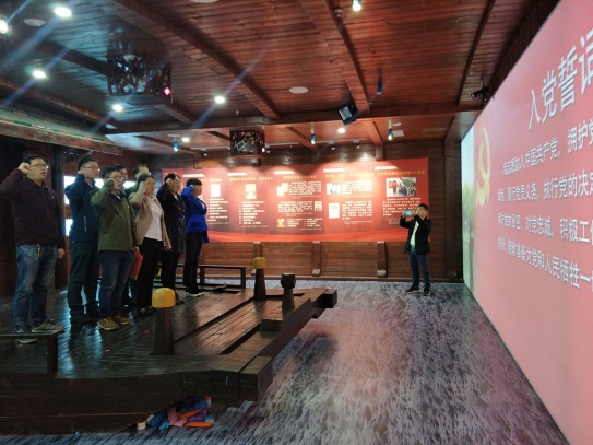 在讲解员的带领下,依次参观了党性溯源展厅、薪火传承展厅、丰碑永铸展厅、不忘初心展厅及高原明珠展厅(图2)。从中学习了解到党和国家领导人在贵州和花溪的一些事迹和足迹,体会到各代党和国家领导人对贵州的重视;而视频学习中关于近代和现代全国及贵州的先进个人事迹学习,重温了焦裕禄、黄大发等人的先进事迹和丰功伟绩,也观看了警示教育相关视频;在模拟中共一大最后一天会议的红色游船上,党支部全体成员再次宣读了入党誓词(图3)。看着荧幕上的一件件感人事迹,感受着党从最初建立到现在带领全国人民逐渐走向繁荣富强,党支部老师们纷纷深刻体会到我们一定切身做到“不忘初心,牢记使命”,在新时代充分发挥党员的先锋模范带头作用。