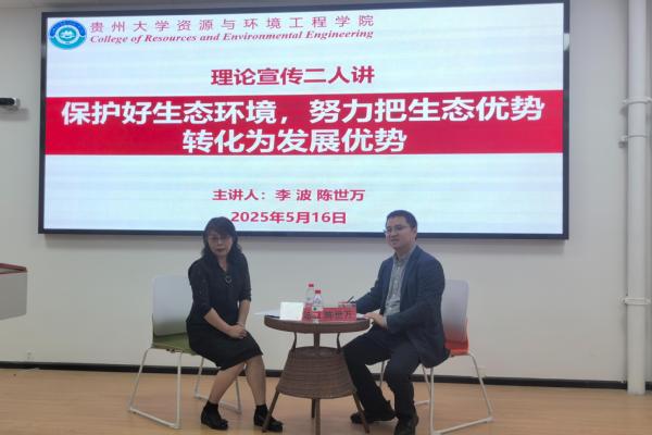 2025516日,资源与环境工程学院在521会议室开展了理论宣传二人讲活动,资环学院党委书记兼关工委委员李波、学院党委委员陈世万、马克思主义学院副教授周莉组成两支宣讲队伍,围绕“保护好生态环境,努力把生态优势转化为发展优势”以及“推动民族文化创造性转化、创新性发展”两大宣讲主题展开深入探讨。正处级组织员陈义、党政办公室副主任兼关工委委员赵远玲、学生科副科长兼关工委委员闵思雨等共计约100名师生参与了此次理论宣传二人讲活动。
