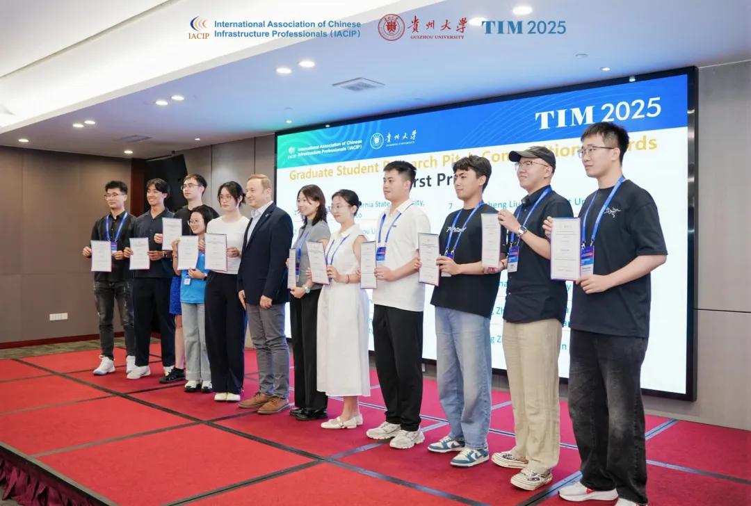 TIM国际交通基础设施大会闭幕式在热烈掌声中结束。闭幕式由贵州大学史文兵教授进行主持,IACIP前主席Jenny Liu教授进行会议总结,并由南佛罗里达大学Qing Lu教授、南阿拉巴马大学Shenghua Wu教授、南卡罗来纳大学Yu Qian教授、加州州立大学Dingxin Cheng教授、香港理工大学Yuhong Wang教授、伊利诺伊大学厄巴纳-香槟分校Erol Tutumluer教授为表现优异的研究生科研快讲竞赛获奖者颁奖。