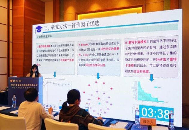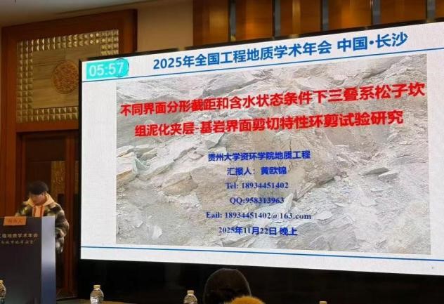 我院地质工程教研室老师史文兵、江兴元、吴道勇、李麟玮、王小明、李慧等6名老师、博硕研究生16名,本科生1名参加了此次会议。江兴元副教授在分会场做了题为“开采扰动与降雨耦合作用下矿山崩滑灾害形成机理与失稳评价方法”的口头报告。吴道勇副教授在分会场作了题为“胶体氧化物对红粘土物理力学性能的调控机制”的口头报告。王小明老师在分会场作了题为“基于物理机制启发的区域土体稀疏抗剪强度智能预测研究”的口头报告。有13名硕博研究生在研究生分会场作口头报告。此次学院的报告包含了工程地质的宏观和微观方面的研究,充分展示了贵州大学工程地质领域的研究。