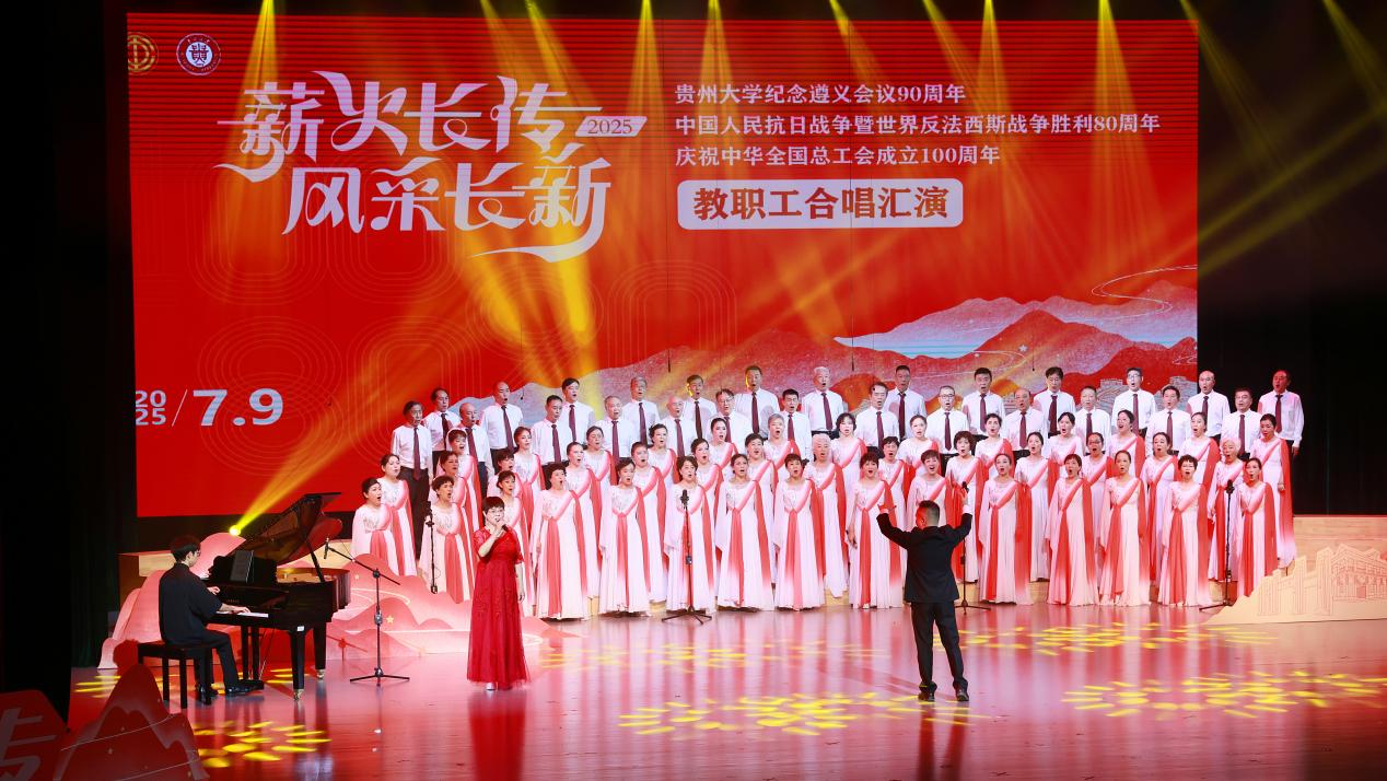 7月9日,我校举行纪念遵义会议90周年、中国人民抗日战争暨世界反法西斯战争胜利80周年,庆祝中华全国总工会成立100周年教职工合唱汇演。退休教职工合唱团受邀演唱序幕歌曲,他们深情演绎了曲目《我爱你中国》,表达了退休教职工对祖国的深厚情感,深深打动了现场观众。