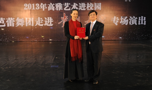 校长郑强向中央芭蕾舞团团长冯英颁发了聘书,聘请她担任艺术学院兼职教授