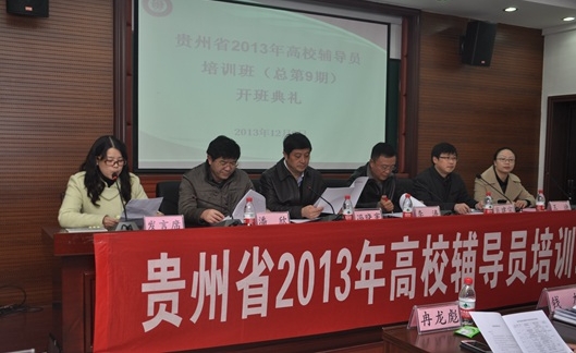 新闻网讯(记者 庞爱忠)12月9日,贵州省2013年高校辅导员培训班第九期开班典礼在我校逸夫楼322教室举行。省委教育工委副书记李涛,校党委副书记冯晓宪出席并讲话,来自全省44所高校的78名辅导员参加培训。校学生工作部(处)长肖建宗主持开班典礼。
