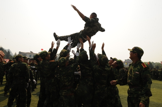 姚小泉书记在成都军区驻贵州大学选培办主任毛佳康的陪同下对新生进行检阅