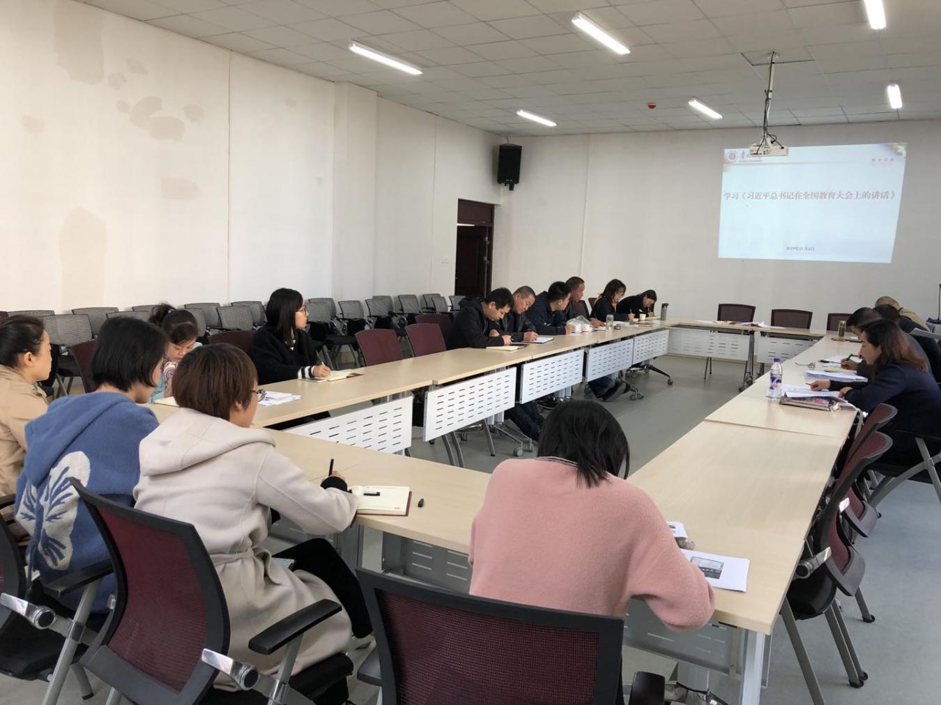 11月8日, 学生工作部、武装部党支部进行主题教育学习,党支部书记于松带领大家学习了《中国共产党党史》——关于建立新中国的一些档案文献回顾、《习近平全国教育大会重要讲话金句》、《习近平总书记关于扶贫工作的重要论述》、“中国共产党第十九届中央委员会第四次全体会议公报”。
