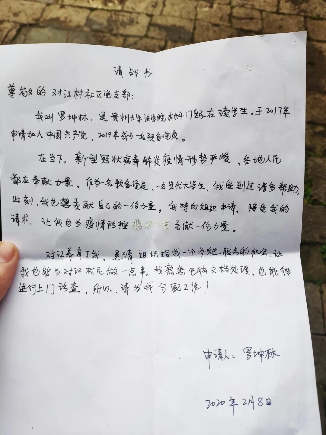 守。”青年志愿者罗坤林这样说。怕不能及时加入防疫志愿者队伍,他还手写“请战书”,希望让村干部看到他的坚