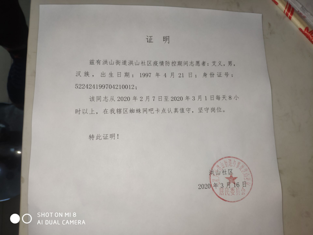 很快,我便接到团区委的联系电话,再到社区报道,根据就近服务原则被分配到毕节市七星关区洪山街道办事处洪山社区负责洪山路蜘蛛网吧路口卡点疫情防控工作。