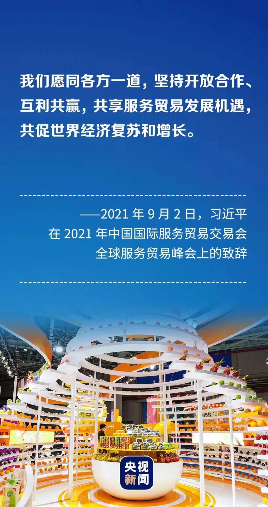 今年9月,习近平主席在2021年中国国际服务贸易交易会全球服务贸易峰会上发表视频致辞,呼吁坚持用和平、发展、合作、共赢的“金钥匙”,破解当前世界经济、国际贸易和投资面临的问题。