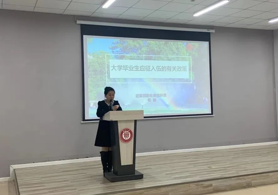 会上,武装部副处级组织员苟敏给大家介绍了征兵工作的重要性以和目前的征兵形势,讲解了宣传动员的重点人群和宣传方法。最后,她从使命担当、法律责任、发展支持、荣誉保障等方面介绍了大学毕业生应征入伍的有关政策,给大学生应征入伍算了政治账、成长帐、荣誉帐、经济帐这“四笔帐”。