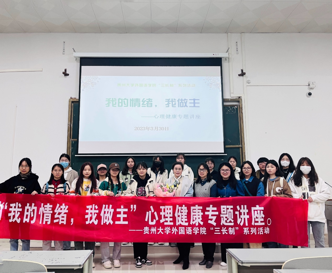 为加强高校学生心理健康教育管理工作,帮助学生更加科学地认识、了解心理健康知识,推动贵州大学“三长制”楼栋文化建设,2023年3月30日晚19点,贵州大学外国语学院以心理健康教育主题活动月为契机,在东校区法学楼101DT成功举办心理健康知识讲座。本次讲座主题为“我的情绪,我做主”,由国家二级心理咨询师帅懿芯副教授主讲,学生科科长韦伊老师主持。东校区14B栋、2栋的楼长、层长及寝室长,外国语学院各班心理委员参加本次讲座。
