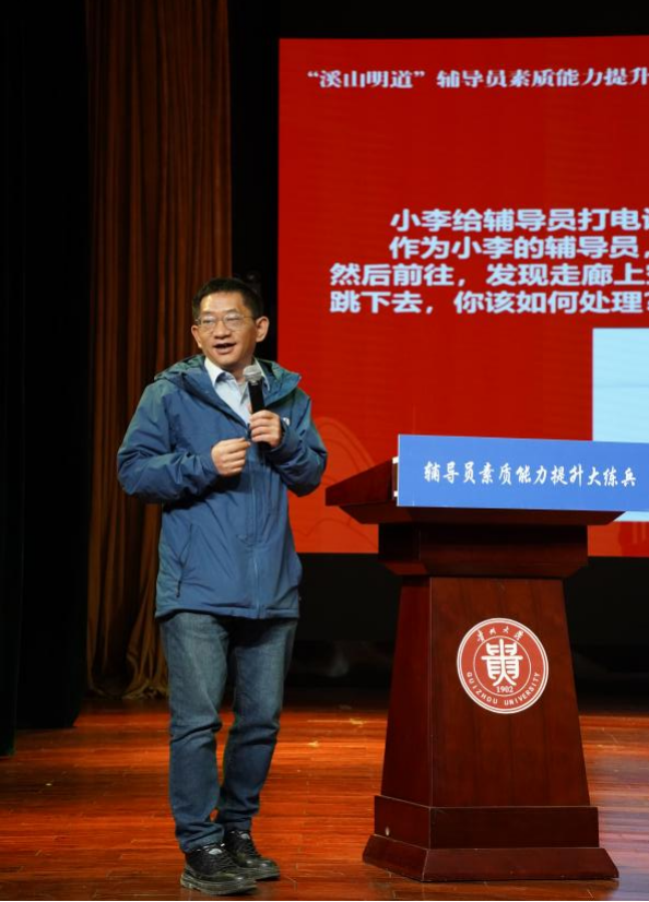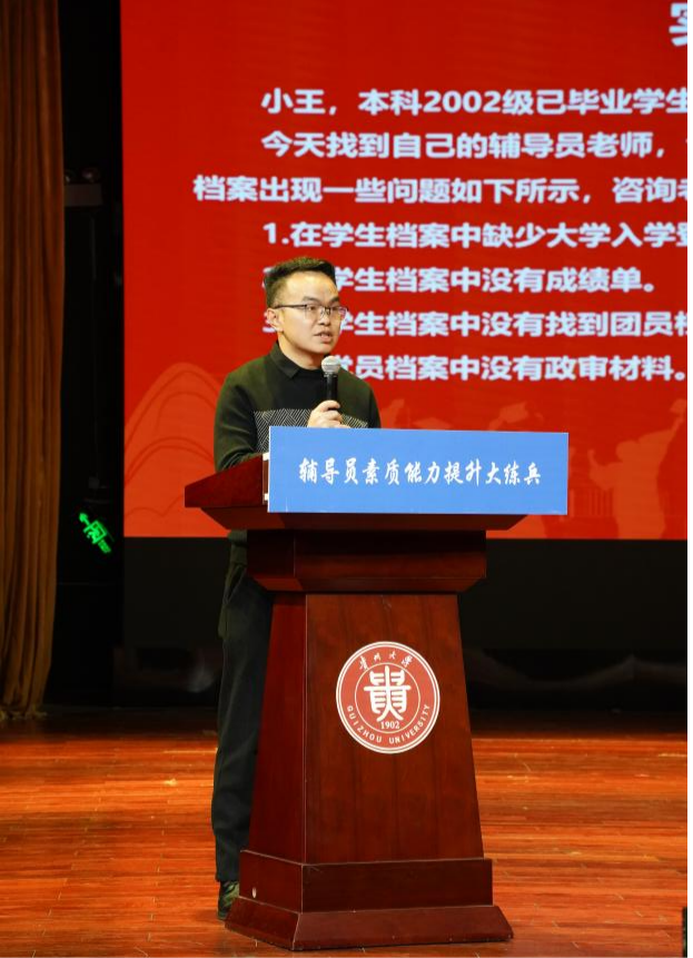 10月31日,贵州大学“溪山明道”辅导员素质能力提升工程之学生日常管理能力提升大练兵在音乐学院实验剧场举行。党委学生工作部部长龙汶、烟草学院正处级组织员金春雷、心理健康教育咨询中心主任晏超,党委学生工作部副部长谭丽娟、崔永霞,各学院党委副书记、分管学生工作的副处级组织员,以及全体专职辅导员参加活动。活动由经济学院辅导员蒋信炜主持。