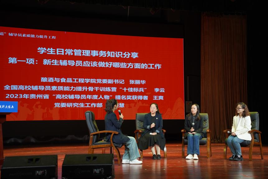 酿酒与食品工程学院党委副书记张丽华、全国高校辅导员素质能力提升骨干训练营“十佳标兵”李云、2023年贵州省“高校辅导员年度人物”提名奖获得者王爽与访谈人党委研究生工作部思政科副科长张筱慧一起,围绕“新生辅导员应该如何做好交通安全教育、学业指导、职业规划等方面的工作”展开了分享。