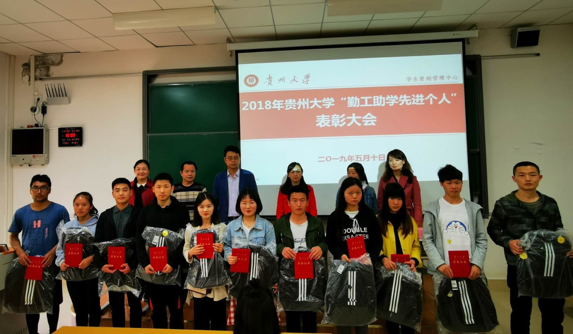 2019年5月10日下午,贵州大学学生资助管理中心在西校区明俊楼举行了2018年度贵州大学“勤工助学先进个人”表彰大会。一百名获表彰学生、学生资助管理中心副主任陈义、郑岚及中心的其他老师参加了表彰大会。