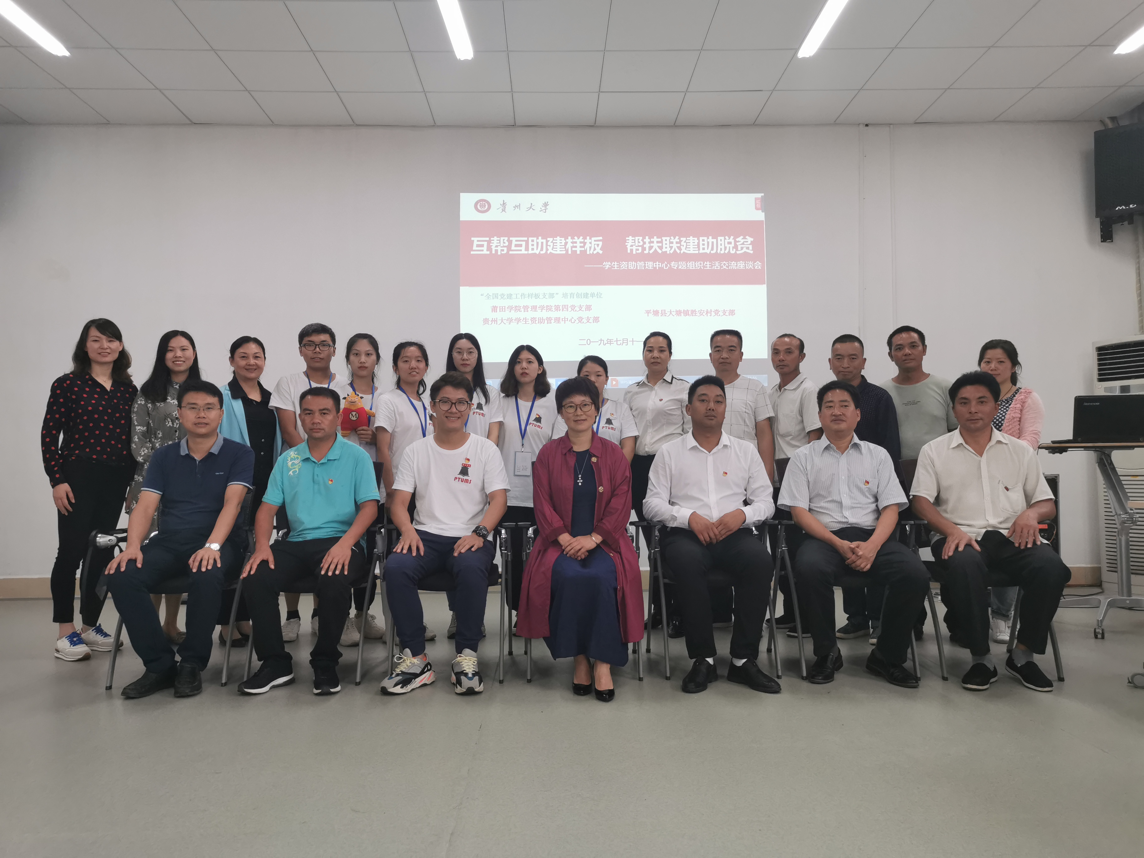 2019年7月11日,学生资助管理中心党支部在贵州大学西校区雅文楼举办了“互帮互助建样板、帮扶联建助脱贫”专题组织生活交流座谈会。帮扶联建的平塘县大塘镇胜安村党支部、“全国党建工作样板支部”培育创建单位莆田学院管理学院第四党支部参与交流,校党委副书记令狐彩桃出席交流座谈会。