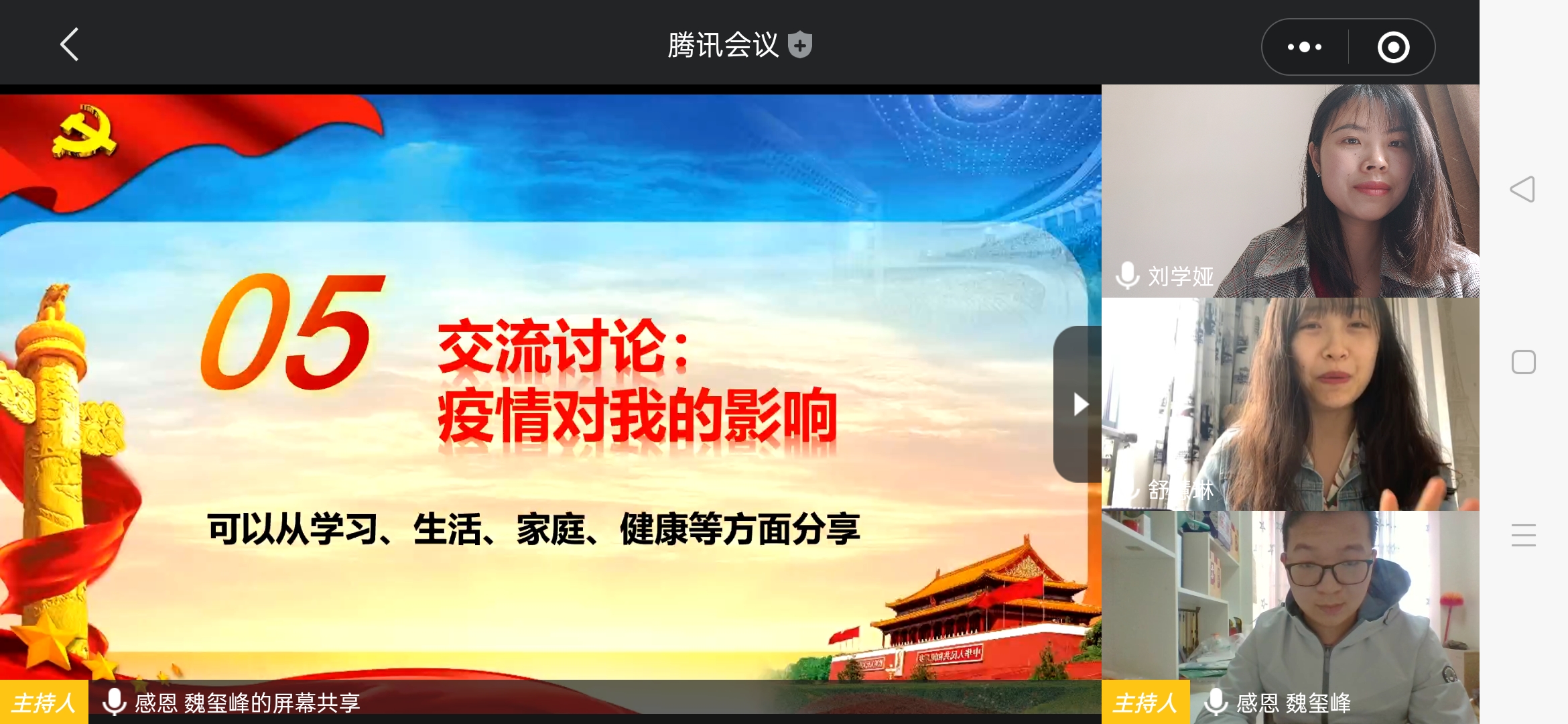 学生资助管理中心党支部为了解学生返校前思想动态、引导学生树立积极乐观的生活态度,于5月27日组织“先锋行”学生流动党支部开展了“疫情中的你我他”组织生活会,本次会议由“先锋行”学生流动党支部书记刘学娅主持,邀请了学生资助管理中心党支部书记陈义、纪检委员唐晔参会。