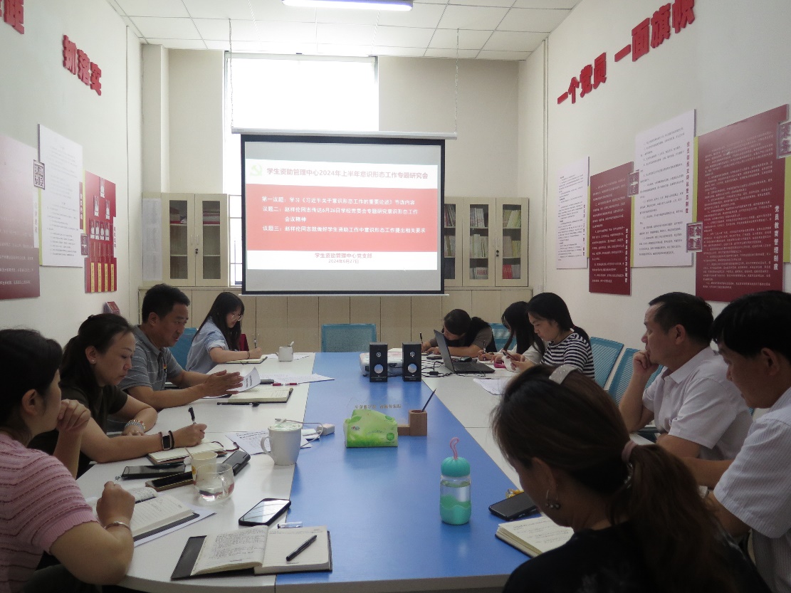 2024年6月28日下午,贵州大学学生资助管理中心党支部在雅文楼105党员活动室召开2024年上半年意识形态工作专题研究会议。全体党员参加,入党积极分子及民主党派人士列席。