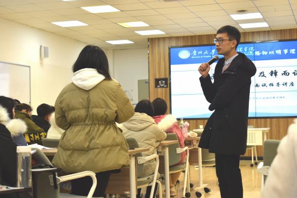 (本网讯 新闻中心 李秋凤 报道|摄影)12月19日上午,贵州大学公共管理学院2020就业公益讲座在雅正楼519室举行。本次讲座有幸邀请到高校公益面试名师团成员周云强老师为我院119位学生做就业面试指导培训,此次讲座由我院学生科韩飞老师主持。