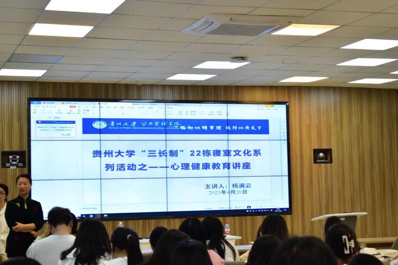 (本网讯 格致文宣工作室 向梦媛 全守源 报道|摄影 王抄)为加强学生对心理健康问题的正确认识,引导学生以积极心理应对负面情绪,传授学生合理有效的负面情绪排解方法,贵州大学公共管理学院于4月20日晚在雅正楼519开展“与心灵相约,与健康同行”心理健康知识讲座。本次讲座由贵州大学心理健康教育与咨询中心副教授、博士、硕士研究生导师杨满云担任主讲,学院副书记邹年娟、学生科老师董淑琴、胡蓉、邓诚出席本次讲座,学院各班心理委员、党员、网格长、寝室长等120余名学生代表参加本次讲座,讲座由董淑琴老师主持。