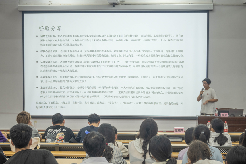 为了帮助本科生同学们深入了解考研、保研的具体规则和流程,切实为同学们办实事、解难题,让同学们尽早明晰今后的学习方向,减轻信息差带来的焦虑,为升学做好充足的准备,贵州大学哲学学院本科生党支部于2023年10月14日晚上在北海艺术设计学院开展“我为群众办实事”活动——考研、保研经验分享交流会,解答同学们对升学等相关问题的疑惑。