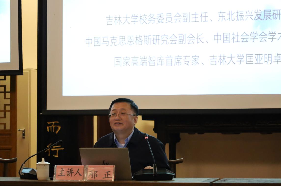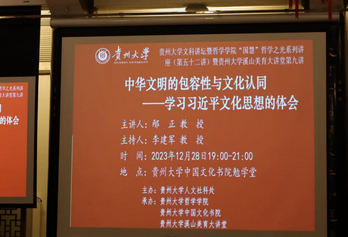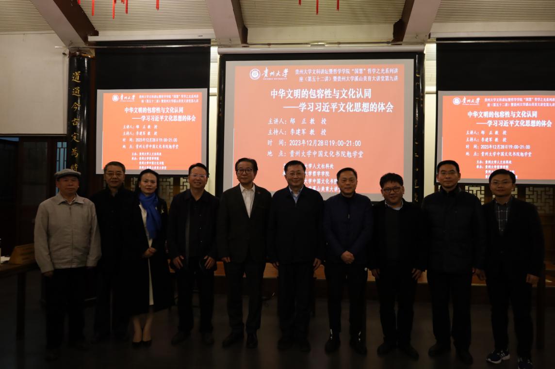 2023年12月28日晚上,“中华文明的包容性与文化认同——学习习近平文化思想的体会”讲座于贵州大学中国文化书院勉学堂成功开讲。吉林大学校务委员会副主任、东北振兴发展研究院院长、中国马克思恩格斯研究会副会长、中国社会学会学术委员会副主任、国家高端智库首席专家、吉林大学匡亚明卓越教授邴正教授应邀主讲,讲座由贵州省第十四届人民代表大会教育科学卫生文化委员会副主席委员、贵州大学李建军教授主持。