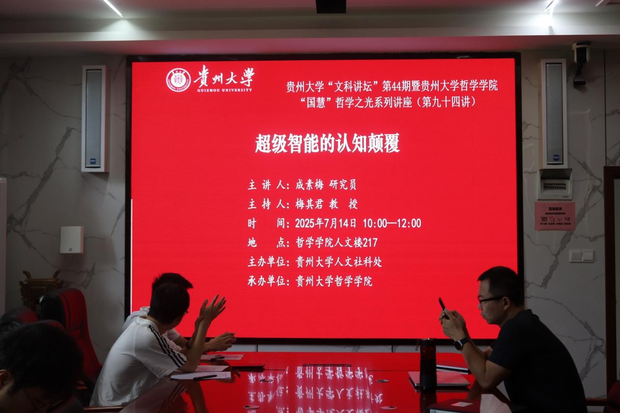 2025年7月14日上午,贵州大学“文科讲坛”第44期暨哲学学院“国慧”哲学之光系列讲座第九十四讲于贵州大学人文楼217会议室成功开讲。上海社会科学院哲学研究所研究员成素梅作了以《超级智能的认知颠覆》为题的讲座。讲座由贵州大学哲学学院梅其君教授主持。