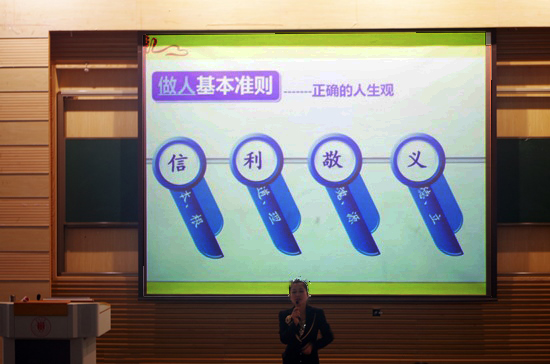 在本次讲座中,杨老师从做人之道和礼仪知识两个方面深入浅出地进行了讲解。通过一段交友之道的视频,介绍了做人之道、沟通之道、合作之道,教育同学们做正直、坦诚、有高素质的大学生;并将礼仪的相关知识融入“慧动青春”这个主题,告诉同学们礼仪在学习生活中的重要意义,强调了礼仪对个人长远发展的重大影响;最后,杨老师与同学们深入互动,联系实际总结平时应该注重的礼仪以及保持礼仪的方式。