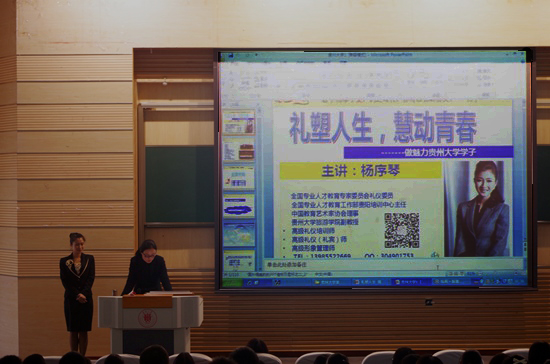 讲座以“礼塑人生,慧动青春”为主题展开,我院党委副书记王丽主持讲座。主讲人是我院副教授杨序琴老师。杨序琴老师,中国教育艺术家协会理事、全国专业人才教育专家委员会礼仪委员、全国专业人才教育工作部贵阳培训中心主任、高级礼仪培训师、高级形象培训师。