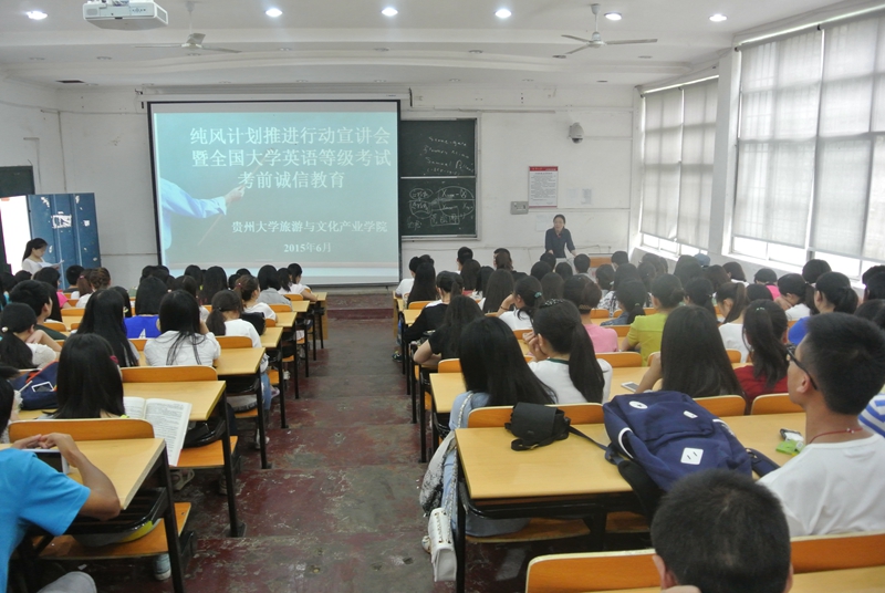2015年6月12日中午1点,我院在逸夫楼114教室召开了“纯风计划推进行动”宣讲会暨全国大学英语等级考试考前诚信教育大会。我院党委副书记王丽老师、学生科科长吴智恒和辅导员谢爽老师以及我院2012级、2013级全体本科生和部分硕士研究生参加了动员大会。