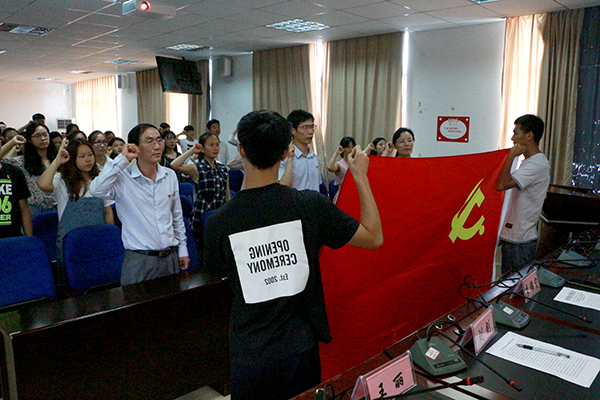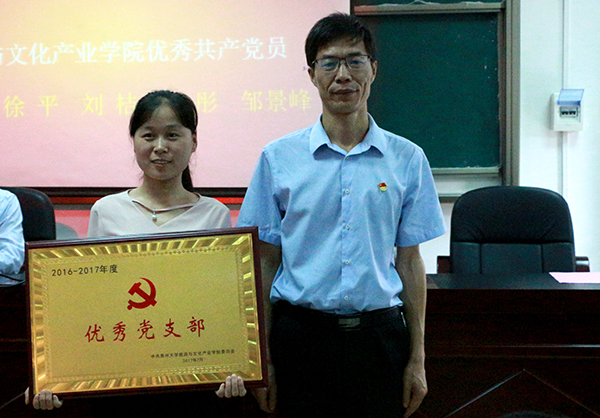 会议在庄严的中华人民共和国国歌声中拉开帷幕。我院党委副书记王丽带领全体新党员面对党旗庄严宣誓,老党员重温入党誓词,不忘入党初心。接着,李锦宏院长宣读了《关于表彰2016-2017年度“优秀共产党员、先进党支部”的决定》。为表彰先进,树立典型,决定授予甘雷、刘桔、徐平、邱彤、邹景峰等五位同志“优秀共产党员”荣誉称号,授予本科生党支部“先进党支部”荣誉称号。党委书记刘剑、院长李锦宏分别为获得表彰的优秀党支部和优秀党员进行颁奖并合影留恋。